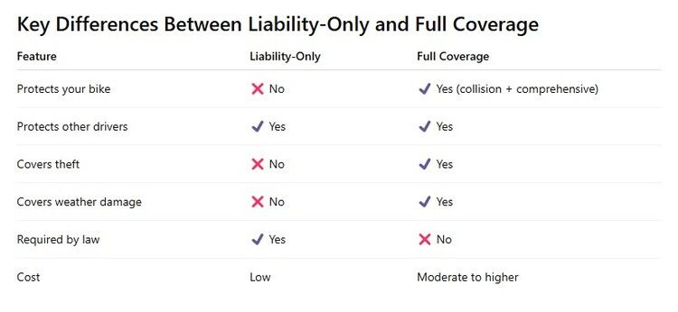 Whether you’re a new rider or a seasoned motorcyclist, understanding the difference between liability-only and full coverage is essential to protecting both yourself and your bike. This guide breaks it down simply so you can make the best decision for your riding lifestyle and budget.